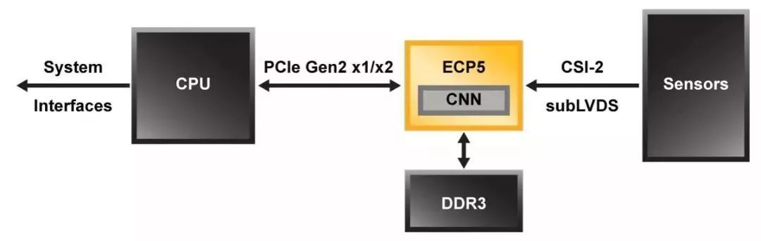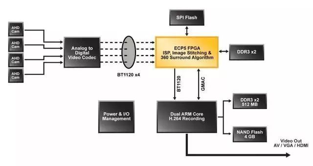 上面的框圖描述了一個開發(fā)者如何使用一個ECP5 FPGA來生成一個鳥瞰子系統(tǒng)(見下文),之前使用多ARM處理器來實現(xiàn)。